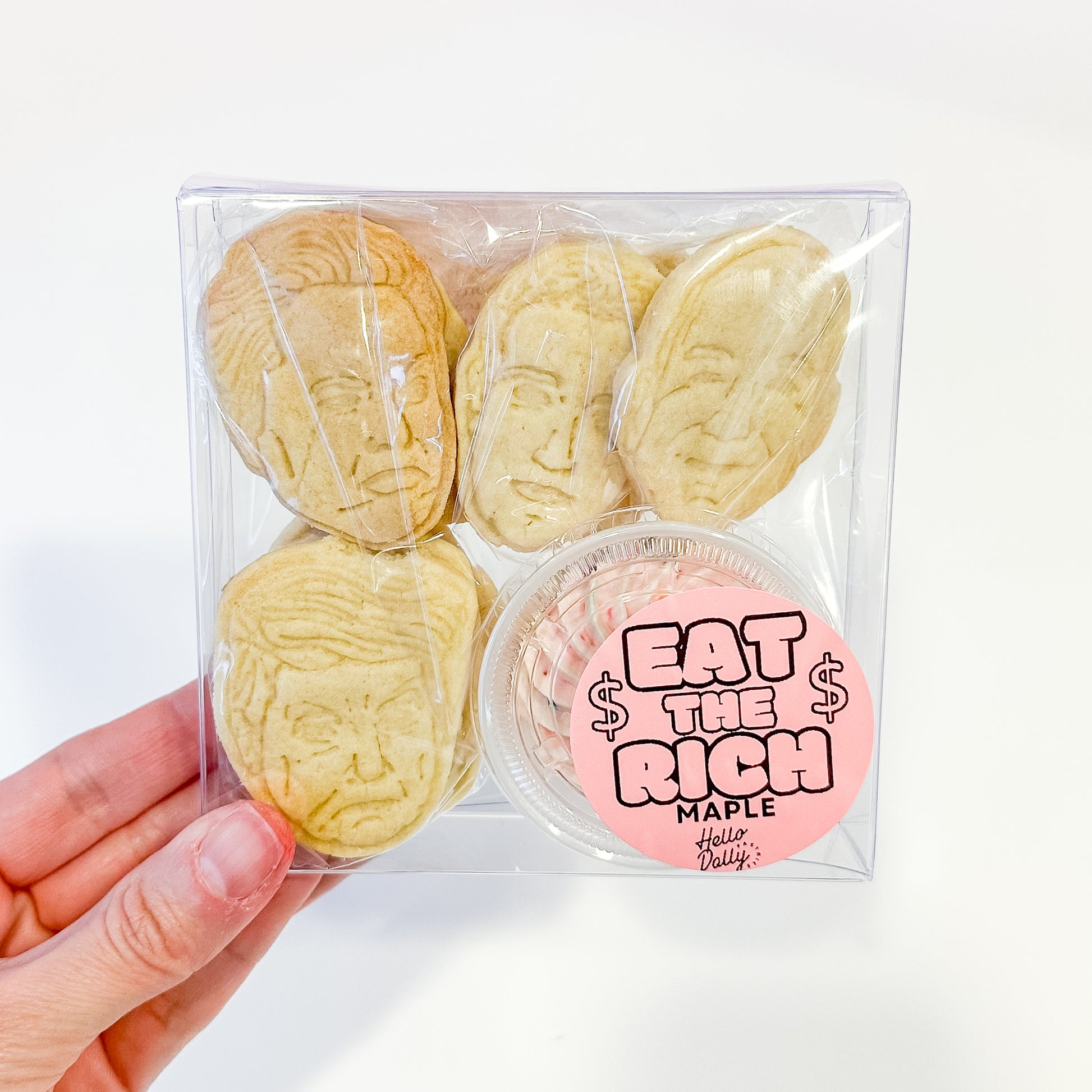 Cookies are heat-sealed in a clear bag to maintain freshness, while the buttercream is packaged separately in a small clear cup with a lid