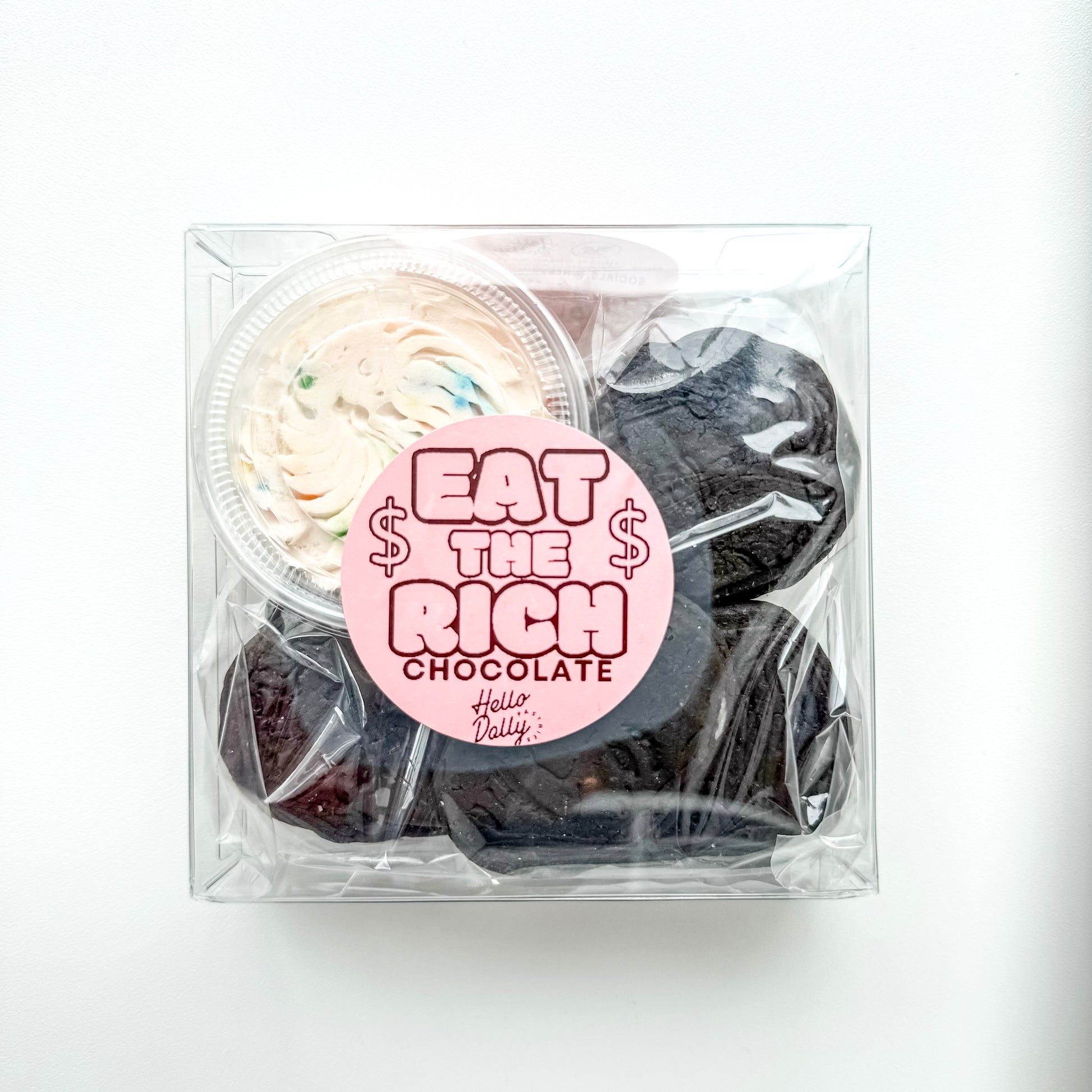 Cookies are heat-sealed in a clear bag to maintain freshness, while the buttercream is packaged separately in a small clear cup with a lid